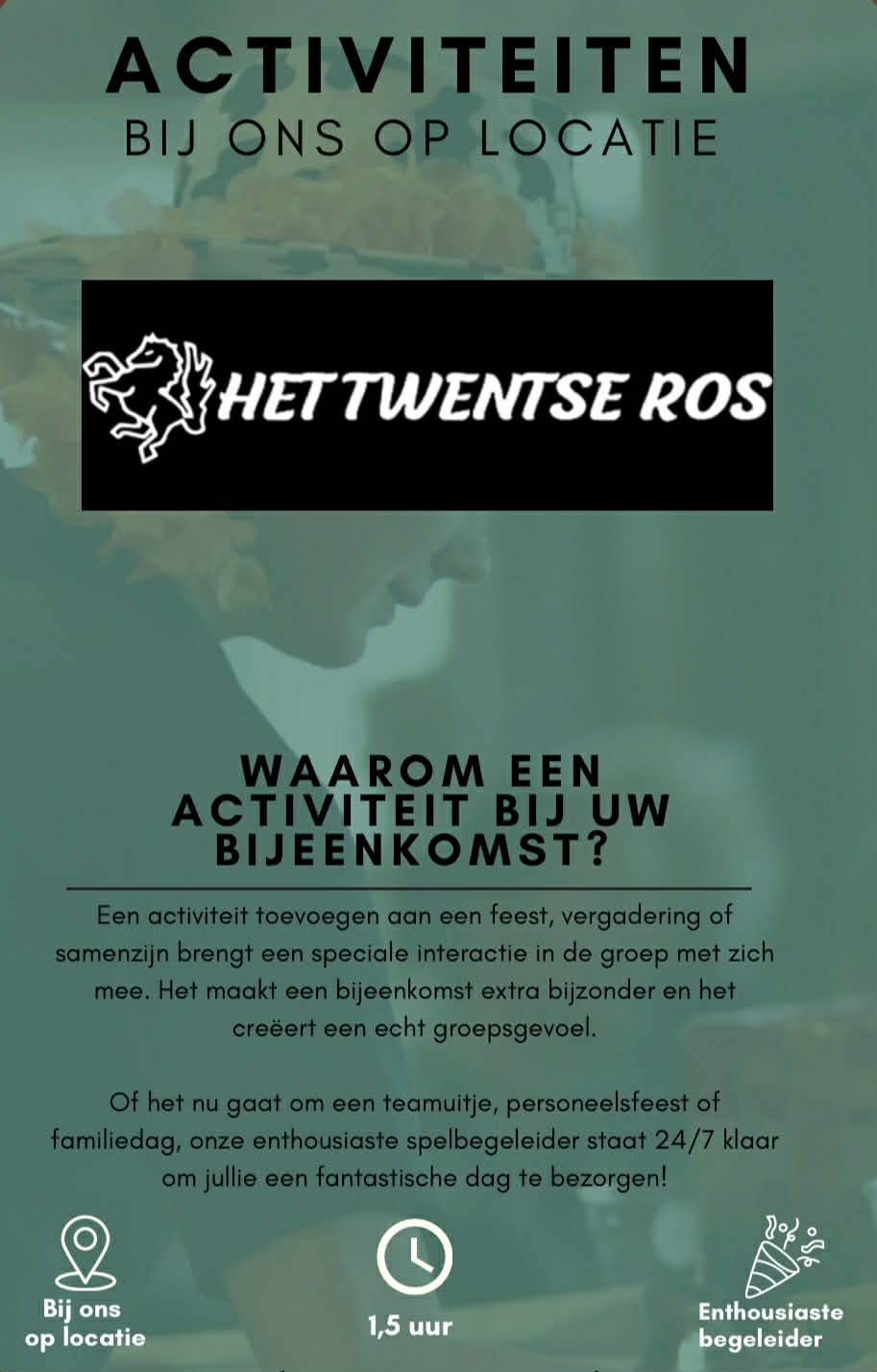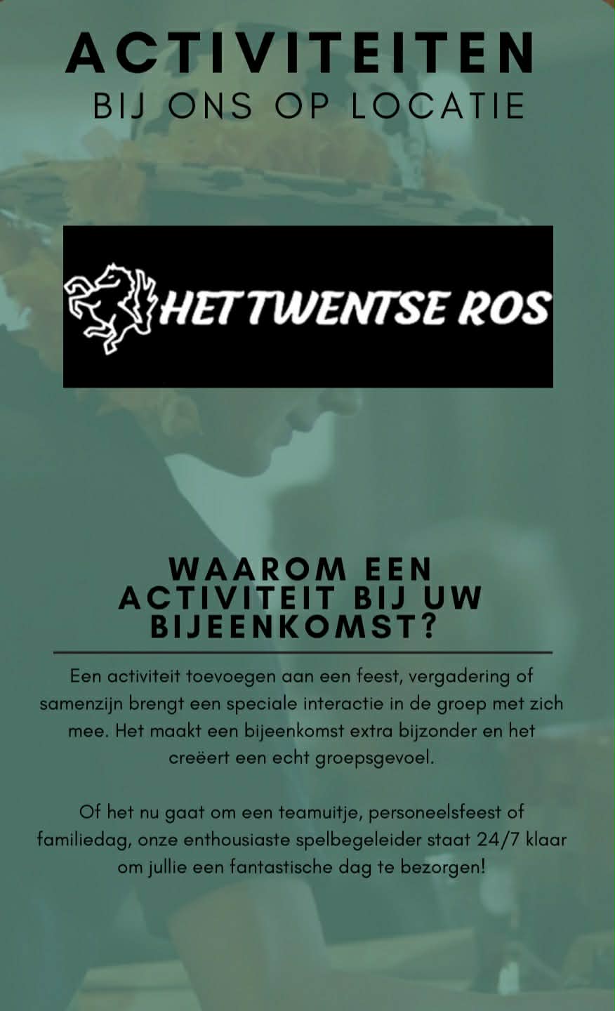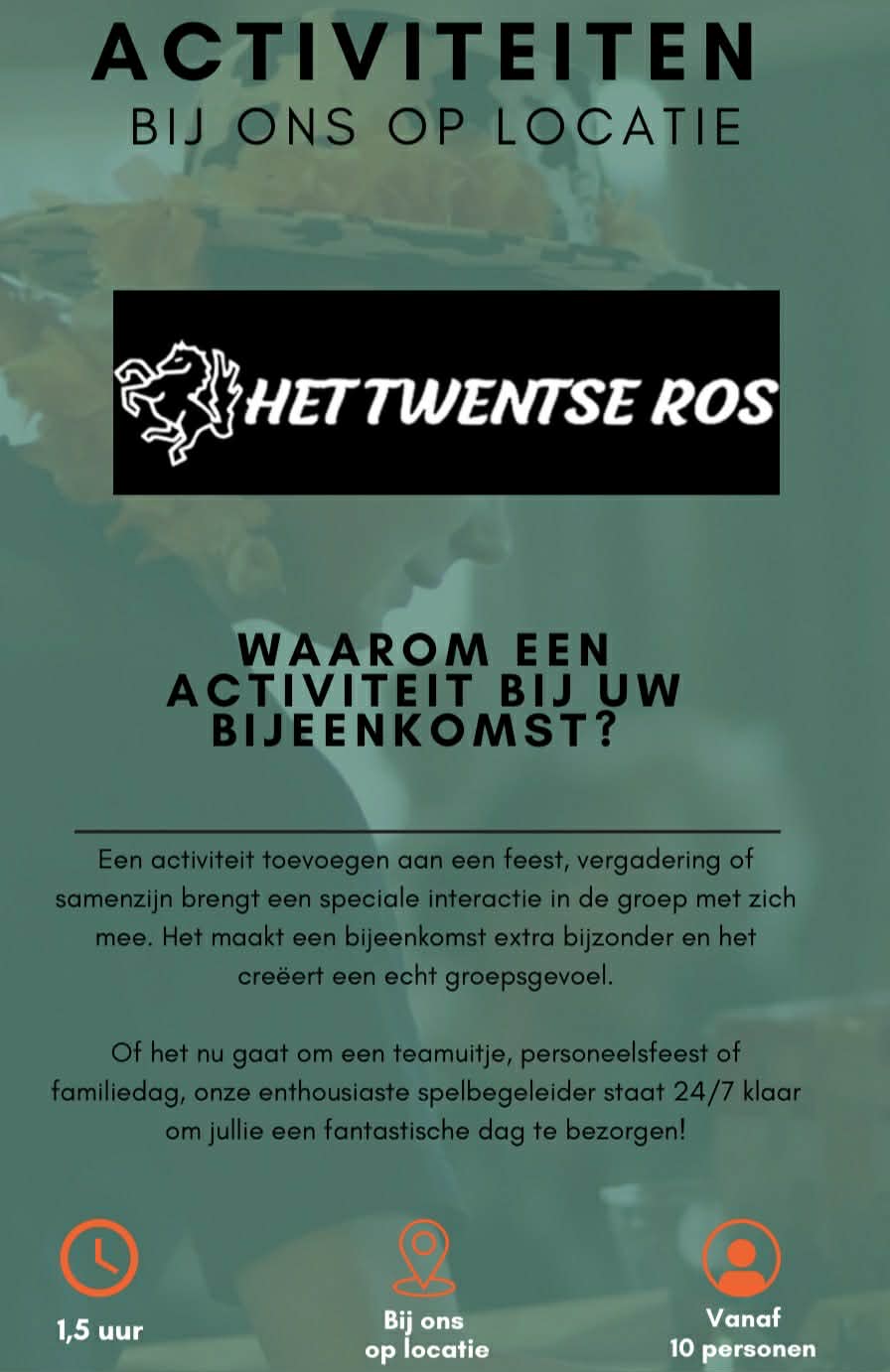 Op zoek naar een unieke locatie voor uw bedrijfsuitje, teamuitje of een gezellige dag met vrienden en familie? Het Twentse Ros in Hengelo is dé plek waar plezier, uitdaging en verbinding samenkomen. Onze groepsactiviteiten zijn speciaal ontworpen om teams te versterken, vrienden te vermaken en families samen te brengen.
